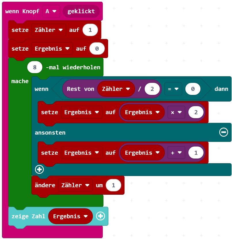 (Tipp: Notiere für jeden Schritt, welche Zahlen in den Variablen sind. Beginne mit "Zähler" = 1 und "Ergebnis" = 0.)
