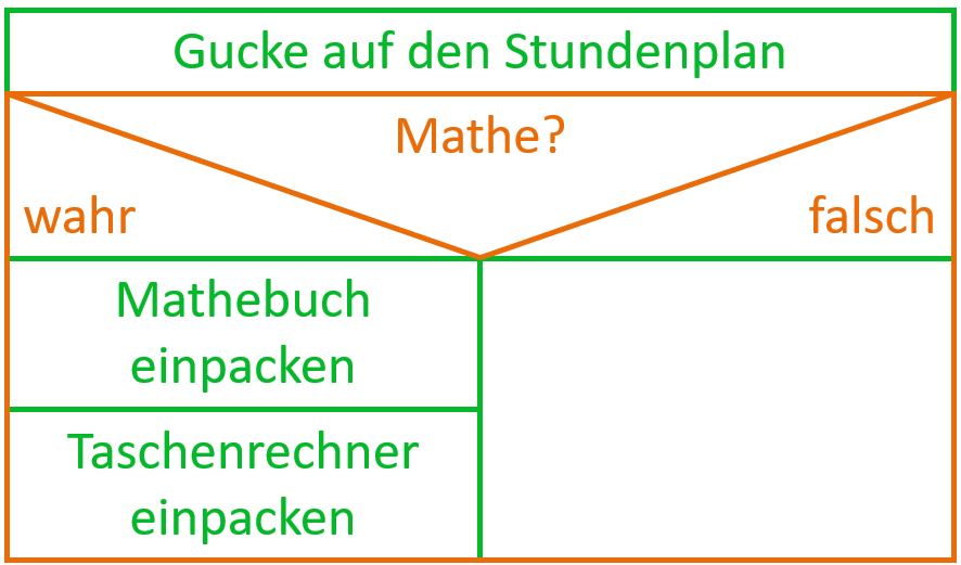 Übung 7: Zeichne ein kurzes Struktogramm für eine typische Morgenroutine. Was wird nach dem Aufwachen in welcher Reihenfolge getan? Du kannst deine eigene Morgenroutine zeichnen oder dir eine allgemeine ausdenken.