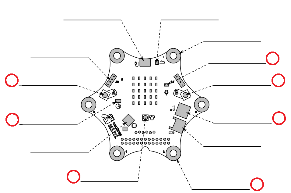 Übung 2: In Kurs 1 haben wir bereits ein Arbeitsblatt ausgefüllt, auf dem einige Bauteile des Calliope notiert wurden. Ergänze auf dem Arbeitsblatt ein "S" oder ein "A" an den Bauteilen für die Einteilung in Sensoren und Aktoren. Nachfolgend ist abgebildet, an welchen dies notiert werden soll.