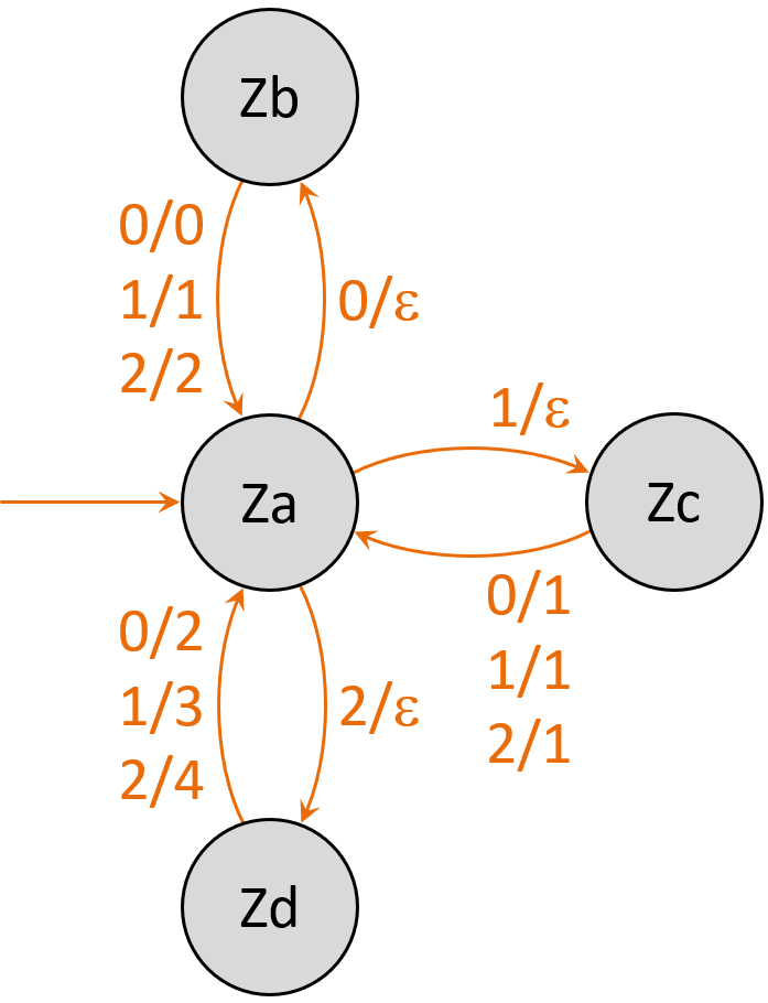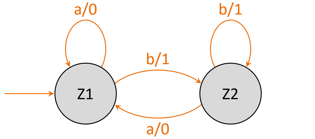 a) Zeichne den Graphen ab und ergänze die Ausgabezeichen an den Übergängen. Damit wird aus dem DEA ein Mealy-Automat.