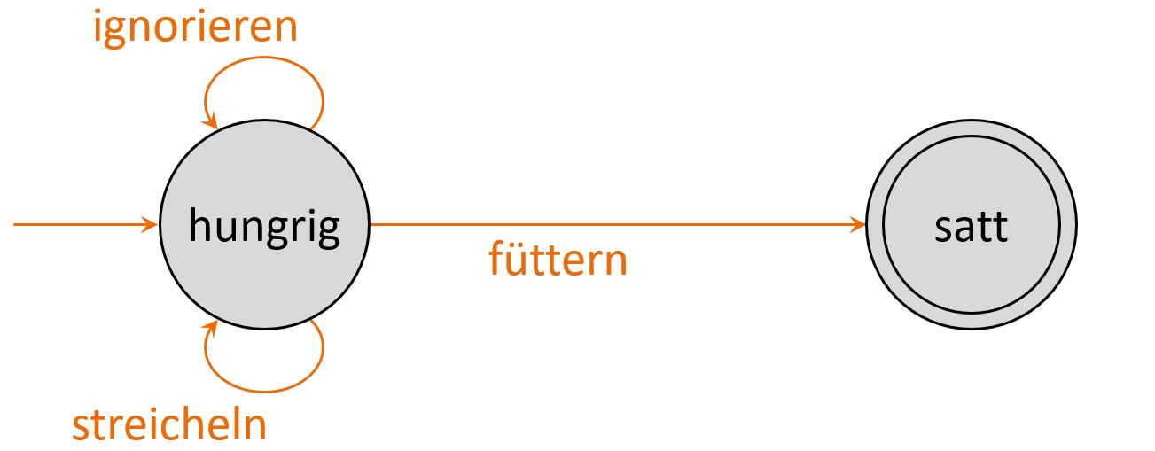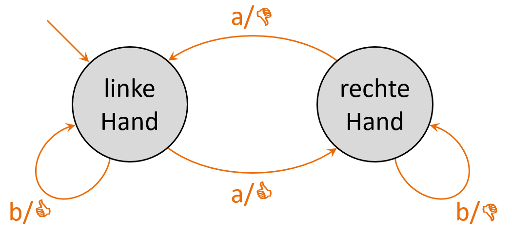 Überlege dir selbst einen Automaten. Er sollte nicht zu einfach und nicht zu komplex sein. Zeichne dann einen Zustandsgraphen dazu und teste, ob deine Sitznachbarn ihn verstehen.