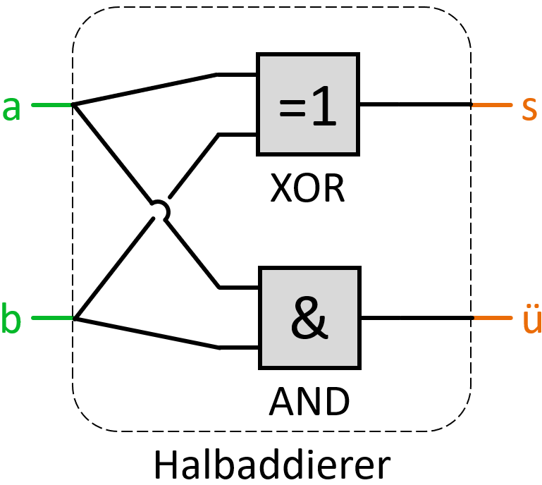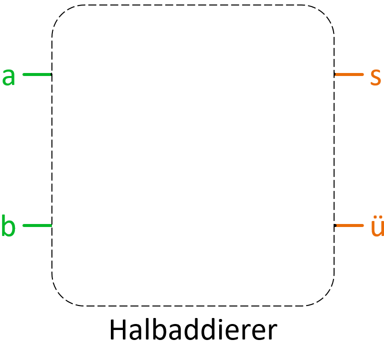 Das Gatter eines Halbaddierers hat also 2 Eingänge (a und b) sowie 2 Ausgänge (s und ü):