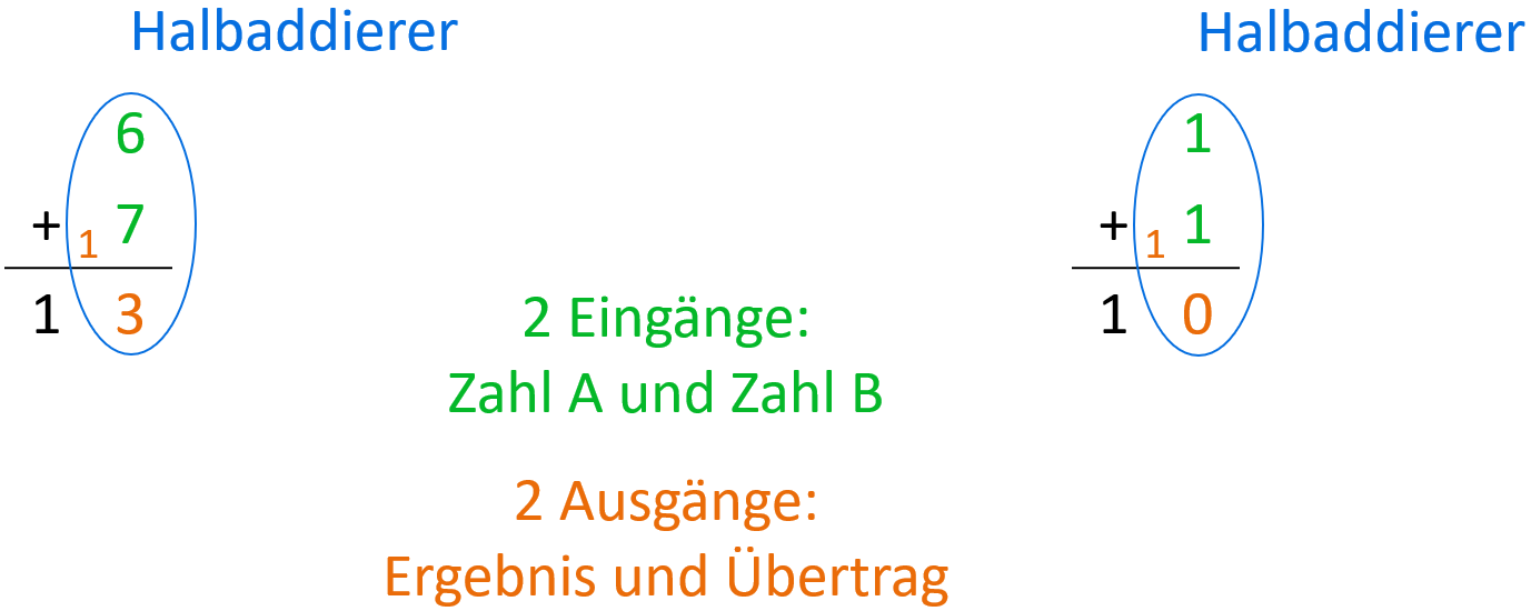 Ein Halbaddierer kann einzelne Ziffern addieren und bei Bedarf einen Übertrag weitergeben. Das ist bekannt aus der schriftlichen Addition: