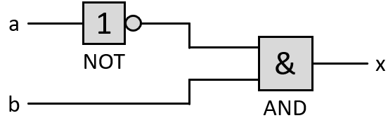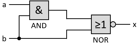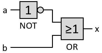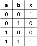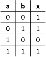 Solch einen Termin erhält man, indem in der Tabelle alle Zeilen logisch beschrieben werden, die eine 1 als Ausgabe haben. In der obigen Tabelle also die Zeilen 1, 2 und 4. Die erste Zeile hat als Eingaben a = 0 und b = 0. Damit daraus eine 1 ausgegeben wird, muss also gelten "nicht a und nicht b". Die weiteren Zeilen hängt man mit einem "oder" ran.