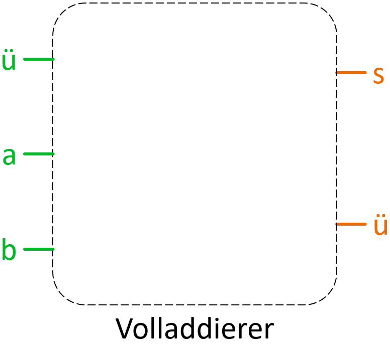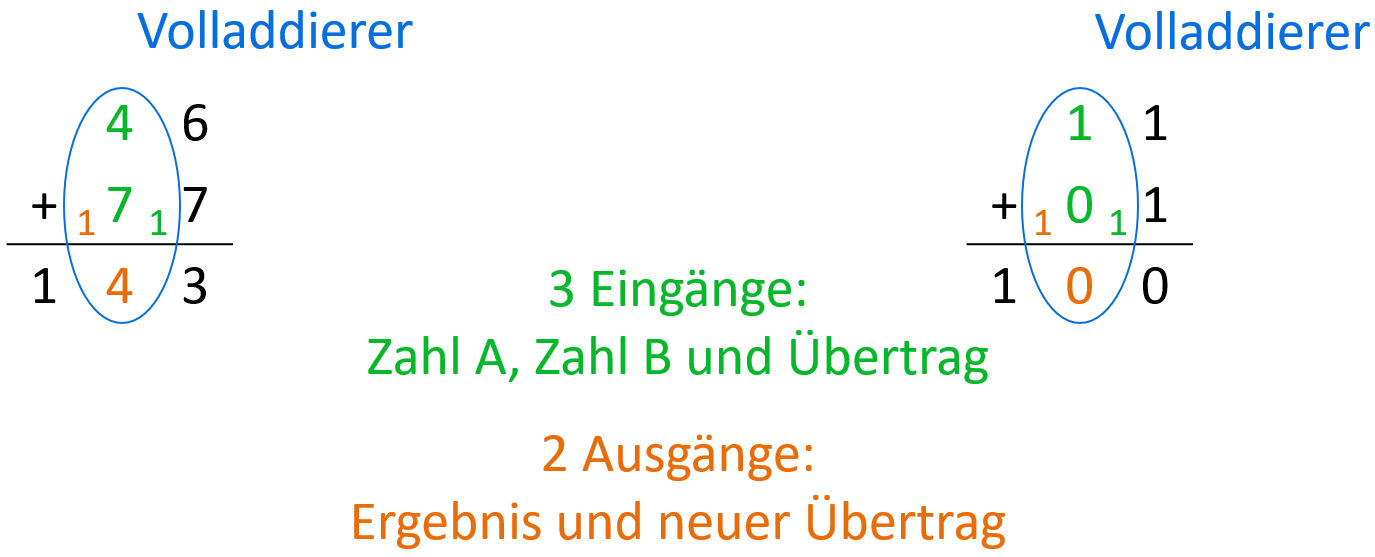 Nur so können längere Zahlen richtig addiert werden. Dadurch muss er 3 Eingänge (zusätzlich das ü der vorherigen Berechnung) besitzen.