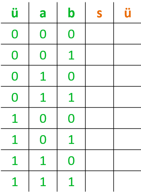 Die Wahrheitstabelle sieht also wie folgt aus, wobei a und b die zu Addierenden Ziffern sind, s die Summe der beiden und ü der Wert des Übertrags.