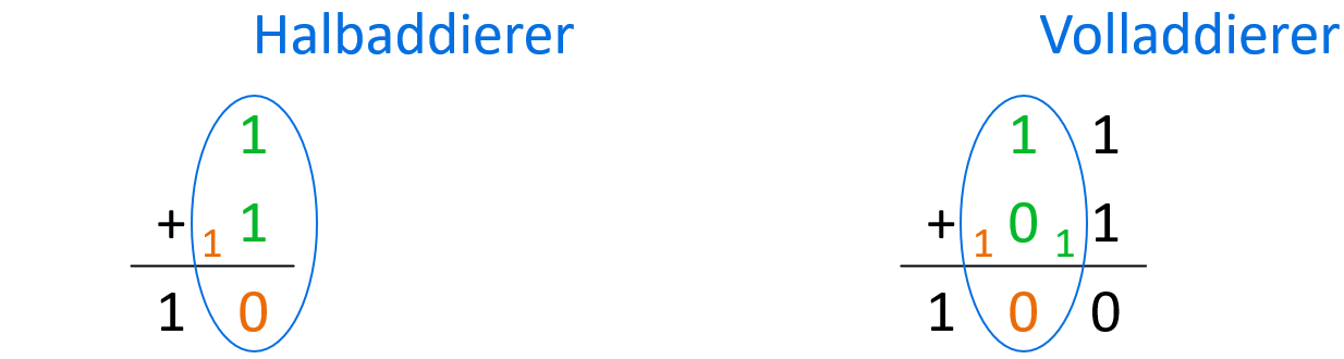 Erläutere einen sogenannten Volladdierer mithilfe der Darstellungen. Gehe dabei auch auf den Unterschied zu einem Halbaddierer ein.