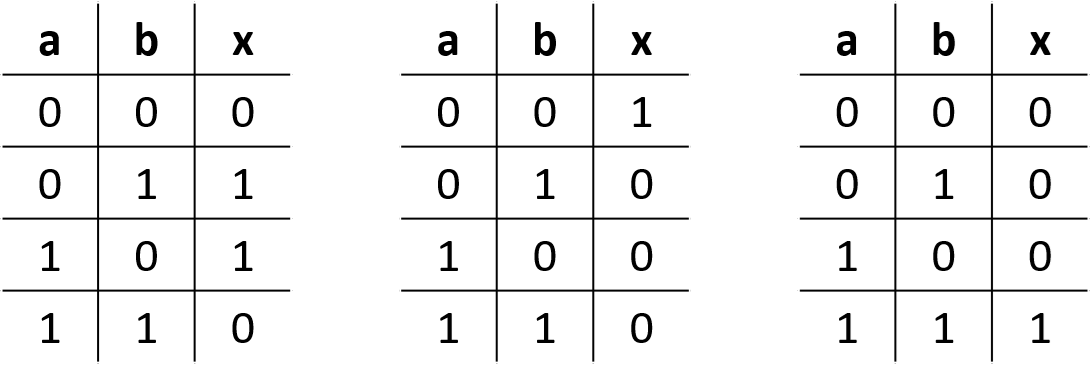 Welche Gatter sind hier mit Wahrheitstabellen dargestellt?