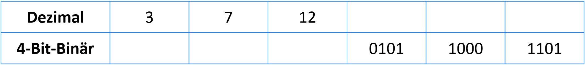 Unser übliches Zahlensystem (die Dezimalzahlen) besitzen an jeder Stelle zehn mögliche Ziffern (0 bis 9). Damit besteht die Dezimalzahl 13 aus den Ziffern 1 und 3. Binärzahlen besitzen nur zwei mögliche Ziffern (0 und 1). Die Dezimalzahl 13 entspräche dabei der Binärzahl 1101. Eine Ziffer entspricht dabei einem Bit. Wir werden 4-Bit-Zahlen betrachten, also immer 4 Ziffern.